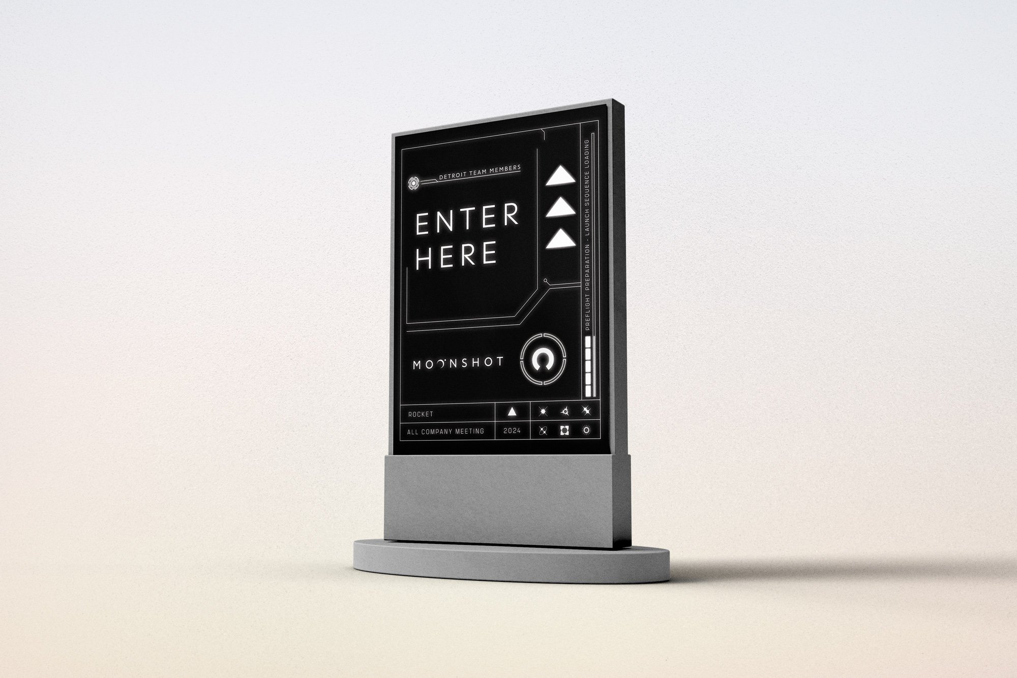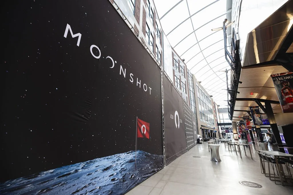 about: moonshot was this years all-company meeting for the rocket family of companies. the event focuses on business updates, goals and future plans. this event took place at little caesars arena in detroit, michigan. i was responsible for conceptual ideation and execution of print and digital graphic assets for the event.