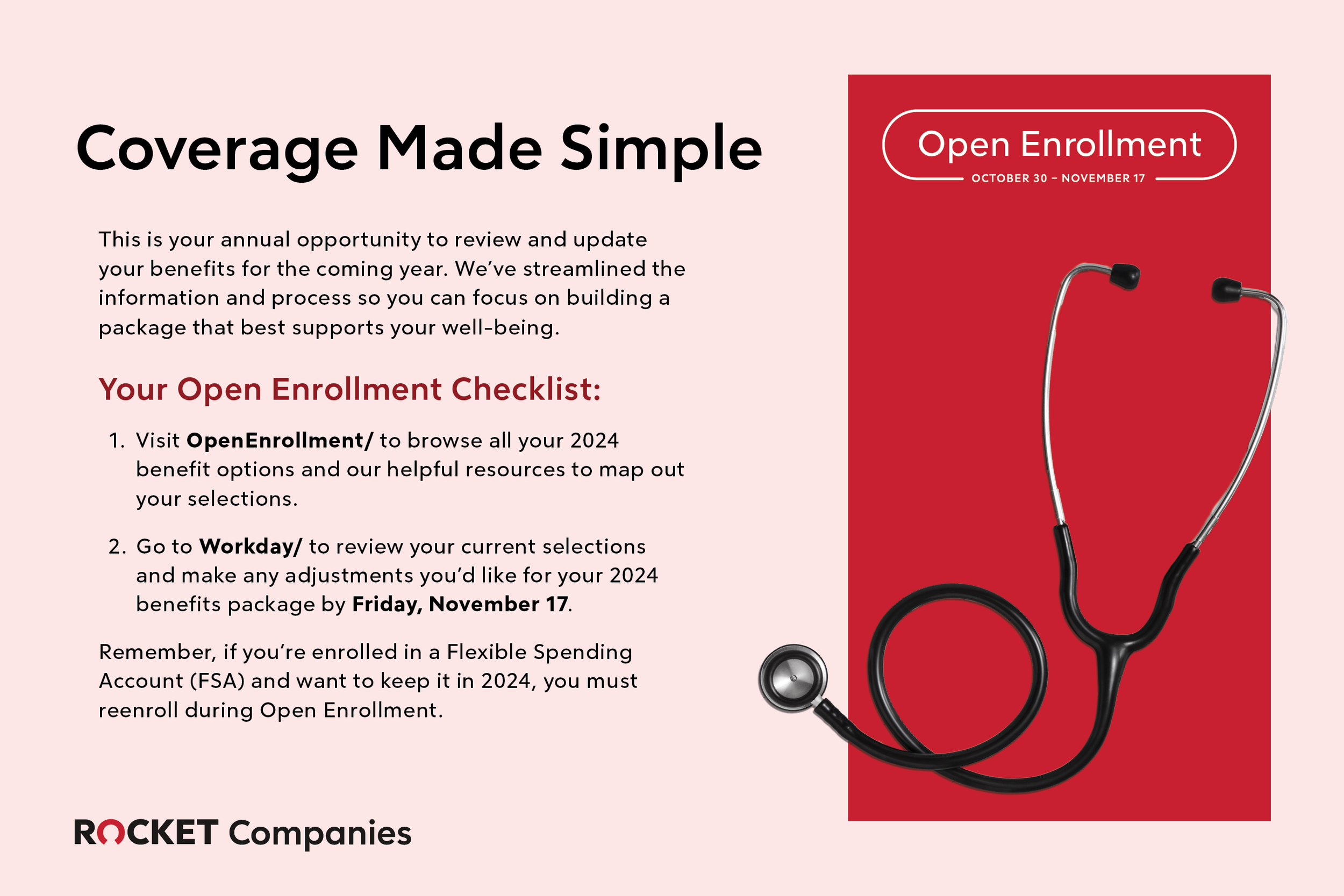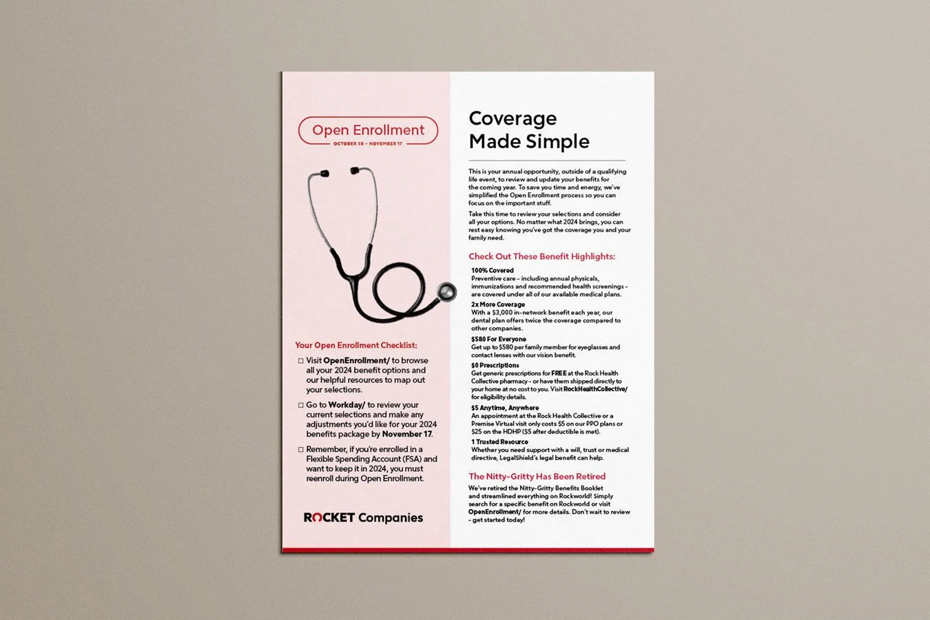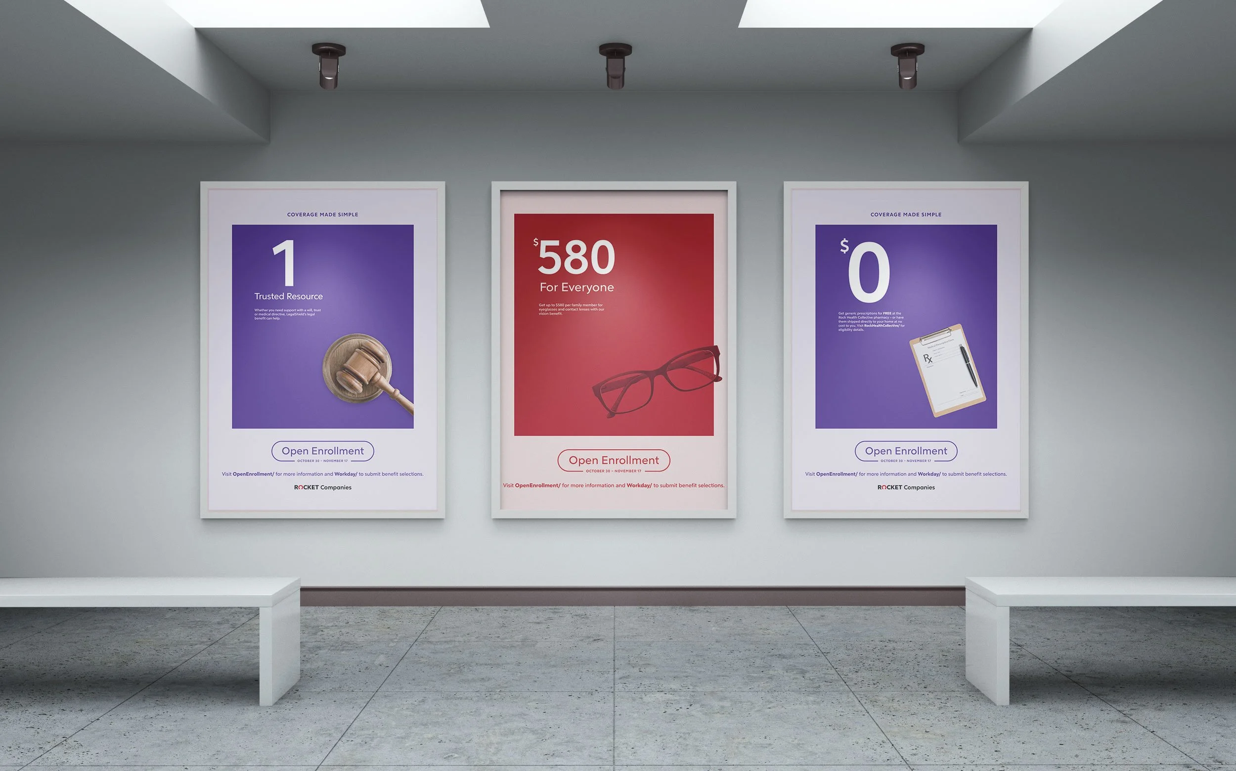 An internal campaign for rocket companies 2023 open enrollment. i was responsible for conceptual ideation and execution of print and digital graphic assets for the event.